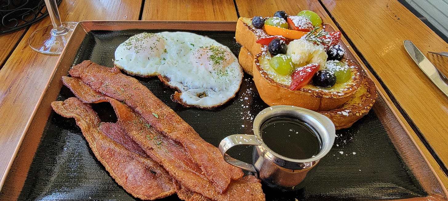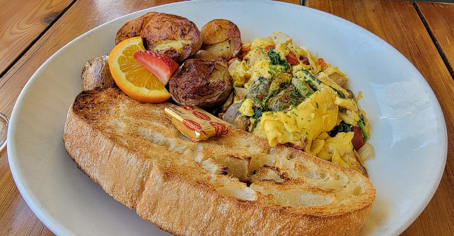 I ordered up the Sunrise French Toast with a side of their thick cut bacon and two eggs cooked perfectly over easy, and I helped Kay decide on the Farmer’s Scramble (Tofu, baby kale, onion, mushroom, tomato, red bell pepper.) with a side of house potatoes and a massive piece of ciabatta toast.