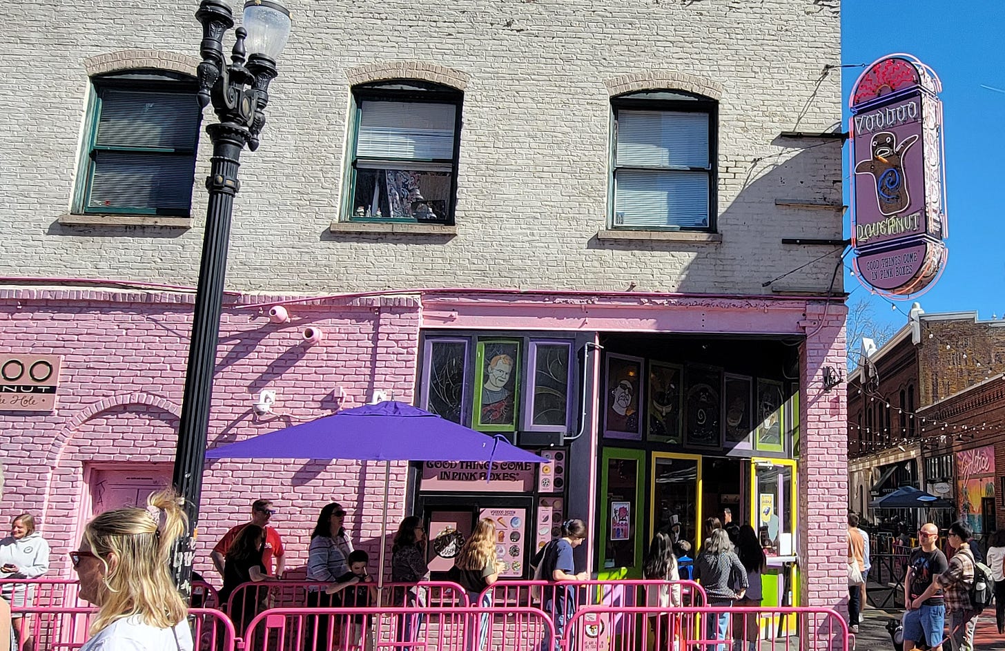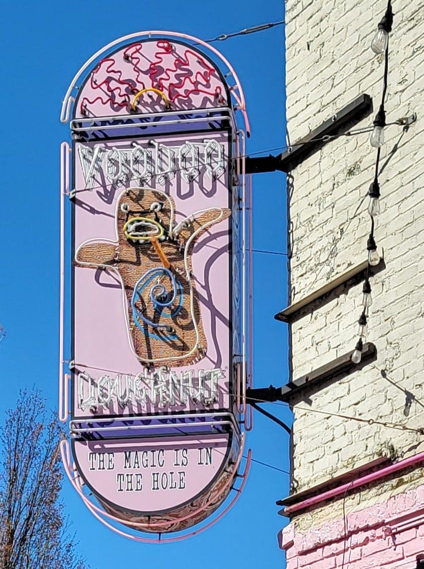 The doughnut store is right at the entrance to Portland Saturday Market where hundreds of vendors hawk their wares every Saturday and Sunday from March through Christmas Eve along the Willamette River.