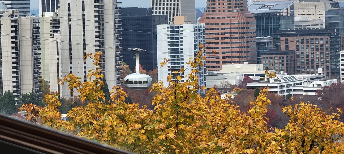 At this point it was getting on in the day and everyone was starting to wear down, so with one more stop on the agenda we headed south along the waterfront to the Portland Aerial Tram station. I didn’t capture any pictures (this one below is from our livingroom last November to remind readers what we’re talking about). We paid the $8 per person for the round trip up the hill to the University/Hospital, exited the tram, went back through the turnstiles and headed back down all in about 10 minutes time. Box checked. Tourist trap visited.