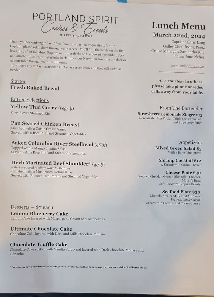 We arrived at the Portland Spirit and quickly were boarded, along with the 20 or so other guests.