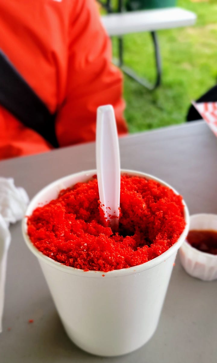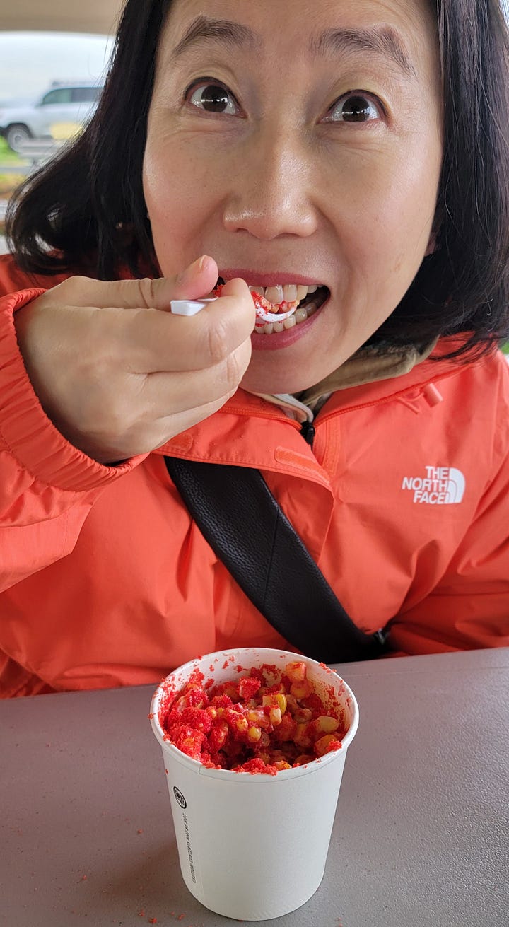 We walked through the fields, took pictures and checked out the food tents, B3 and I settling on a couple corn dogs with Tatiana and Kay trying out the Esquita with Flaming Hot Cheetos dust.