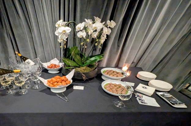Guests were welcomed with a reception spread of veal and porcini meatballs with sauce verte alongside gougères, those light and airy French cheese puffs. The table was set with white orchids, and the wine was already flowing.