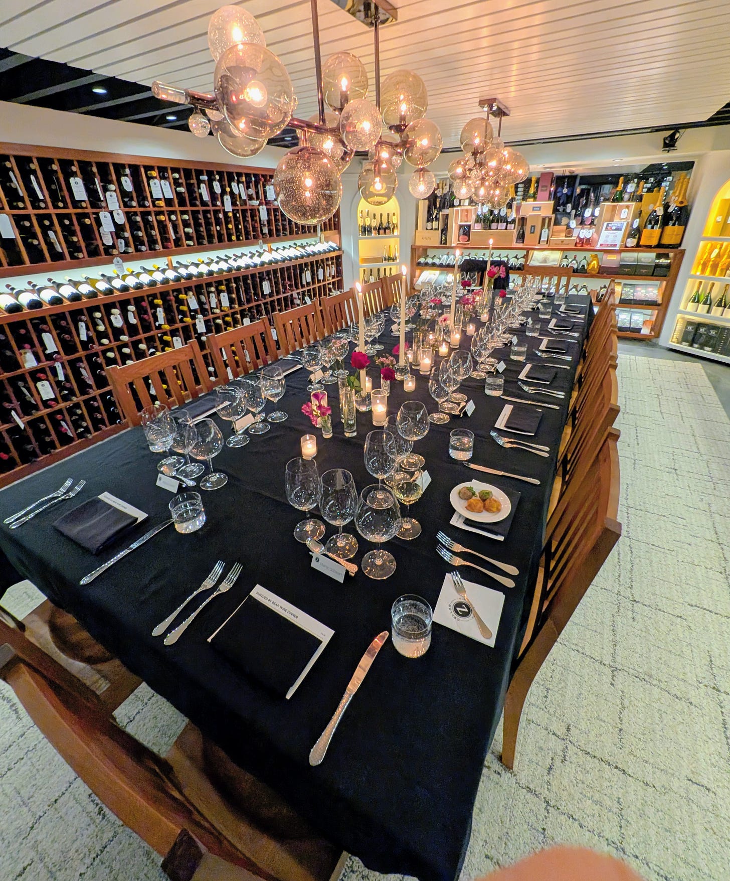 The cellar itself looked stunning. A long communal table was dressed in black linen, surrounded by walls of wine bottles, glowing globe chandeliers overhead, and taper candles that gave the room the feeling of an intimate private dinner rather than a ticketed event. There were sixteen of us seated together, which is exactly the right number for this kind of evening. Close enough for real conversation.