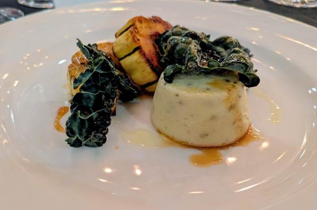 After the reception bites, we sat down to a four-course meal, each course paired thoughtfully with a different Pursued by Bear wine. The meal opened with a Robiola Timbale, paired with delicata squash, pine bud syrup, and kale, served alongside the Bear Cub Red Blend. The timbale was creamy and delicate. The pine bud syrup was something I had never encountered before, and it added a subtle, woodsy sweetness that caught the whole table off guard. It was inventive without feeling forced.