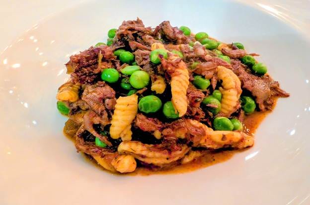 The second course brought Turmeric Cavatelli with braised lamb and English peas, paired with the Pursued by Bear Cabernet Sauvignon. This was the standout of the night for me. The lamb was fall-apart tender, deeply flavorful, and the turmeric-tinged cavatelli held the braise beautifully. The peas were bright and fresh, adding just the right contrast. When Chef John came downstairs to check in, someone at the table told him the lamb was insane. He mentioned the peas might have been a touch crunchy. Personally, I thought lightly blanched fresh peas delivered the perfect crunch and texture that the dish needed, and it gave the dish a snap of freshness against all that richness.
