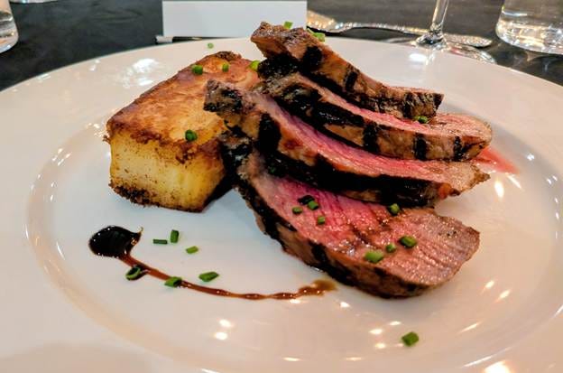 The main course was a Snake River Farms Wagyu New York Steak with a pecorino potato tart and aceto tradizionale, paired with the Baby Bear Syrah. The steak was cooked to a beautiful medium rare with a gorgeous sear, sliced thick and fanned across the plate. The potato tart was crispy and cheesy and everything you want next to a great piece of beef. The balsamic drizzle added just the right amount of acidity. This was a generous, confident plate of food and by the time it arrived I watched several guests audibly gasp as it took their breath away.