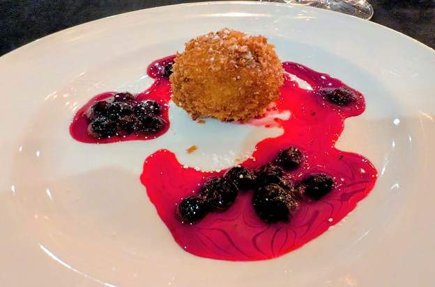 Dessert was a Stracciatella Croquette with huckleberries. A crispy, golden croquette sitting in a vivid pool of huckleberry sauce. The contrast between the warm, crunchy shell and the cool, creamy stracciatella inside was excellent. The huckleberries tied it all back to the Pacific Northwest in the most fitting way possible.
