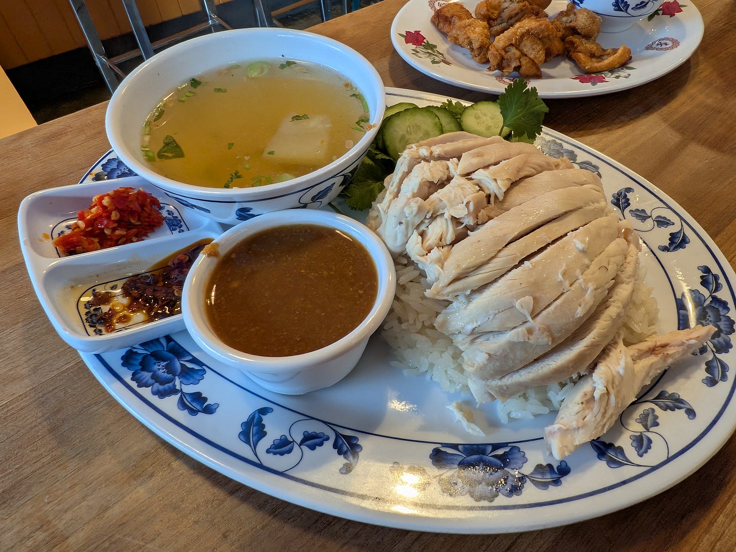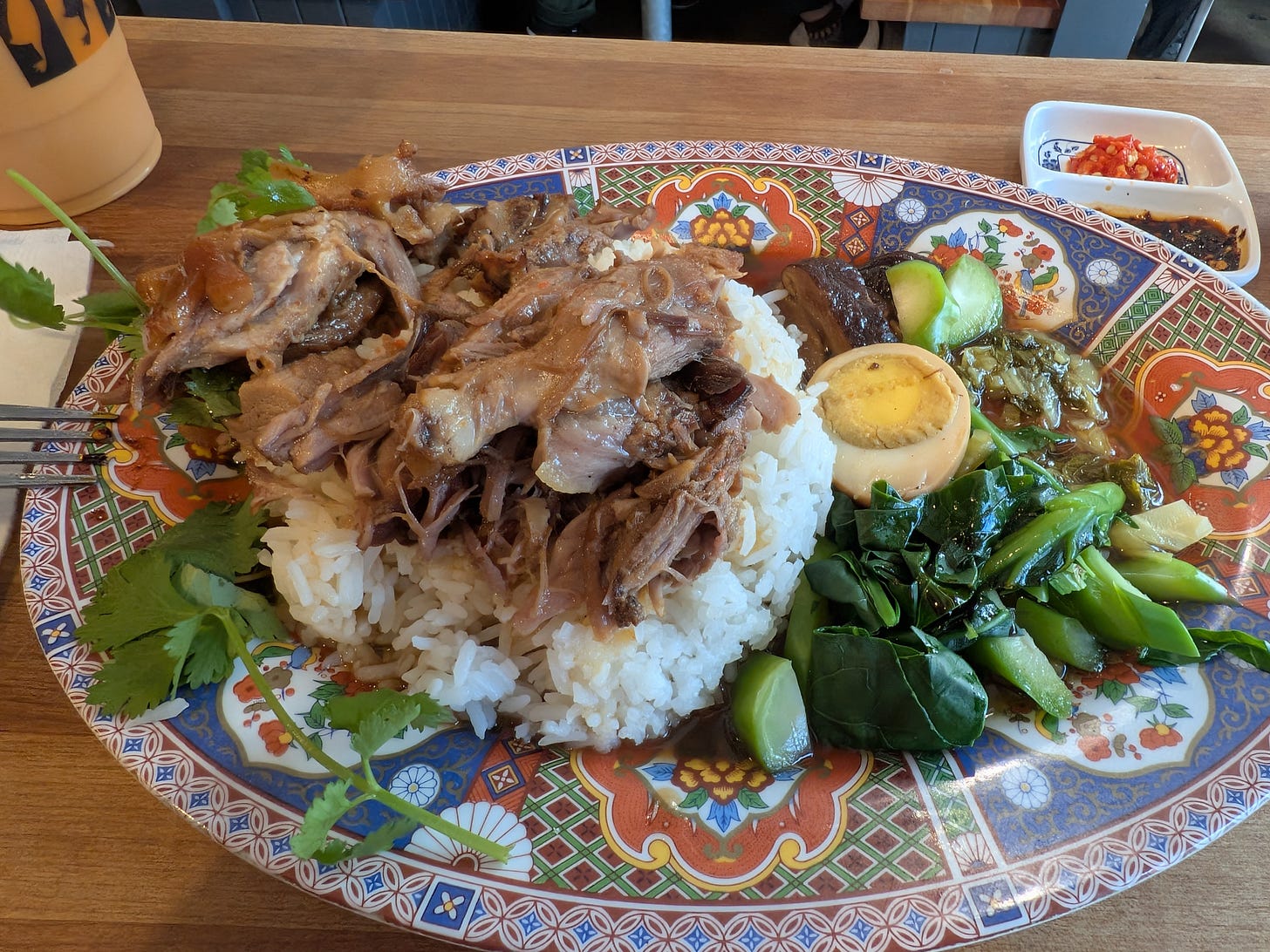 A more recent addition, taped to the menu board, is a Pork and Rice dish (Khao Kha Muu), served with seasoned steamed vegetables. The pork itself was even more tender and savory than the chicken. However, for me, the meal is defined by its signature sauce, which I find achieves its most perfect partner in the classic chicken.