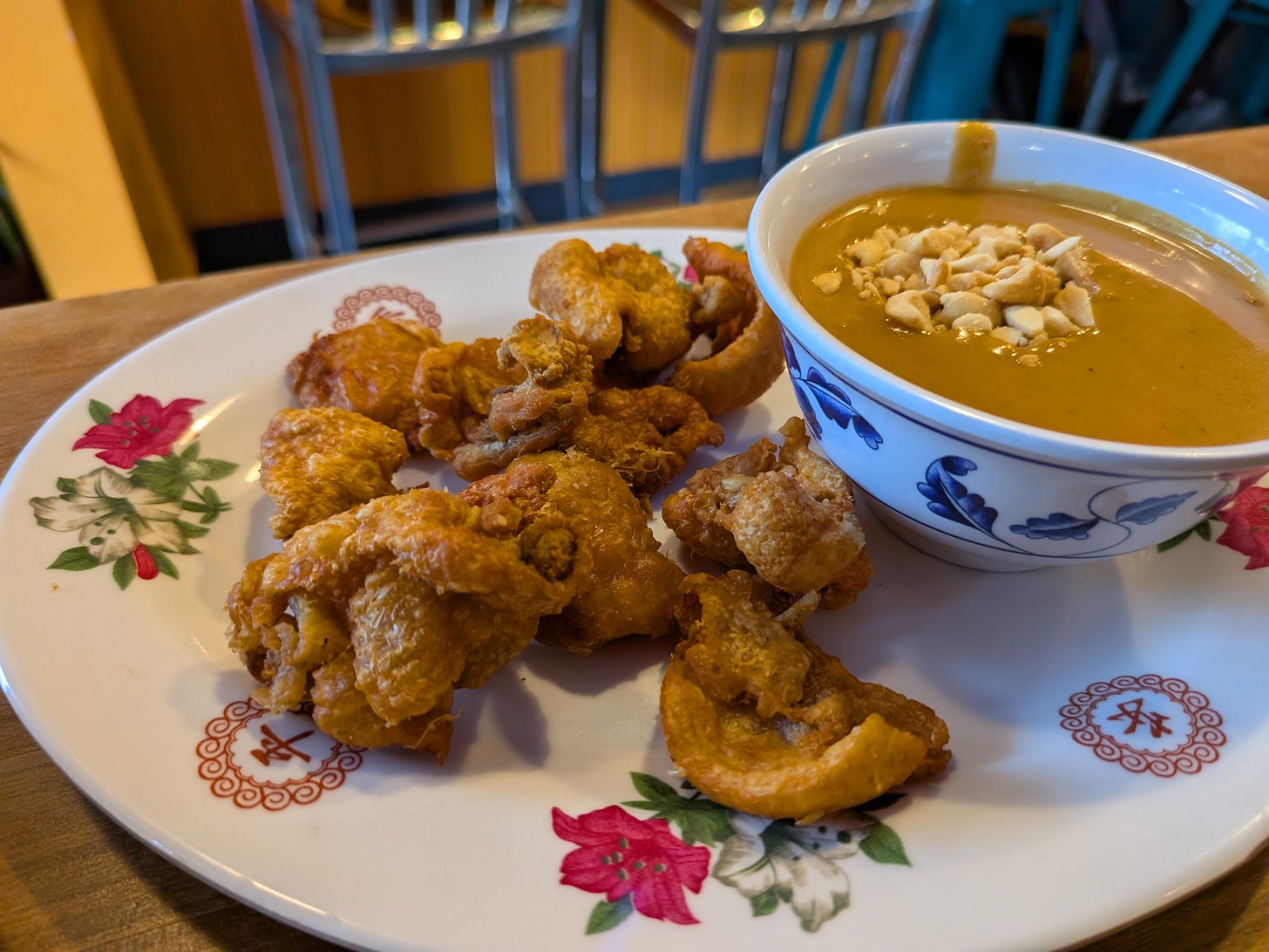 Embodying a brilliant, no-waste philosophy, the chicken skin that is removed during preparation is fried into chicken chicharrónes. Served with a creamy, house-made peanut sauce, they are a fantastic indulgence. While flavorful, I found my batch a bit thick, preventing them from achieving that perfect, shatter-in-your-mouth crispness. As they are made fresh, next time I'll request they be fried a little longer to see if that makes the difference.